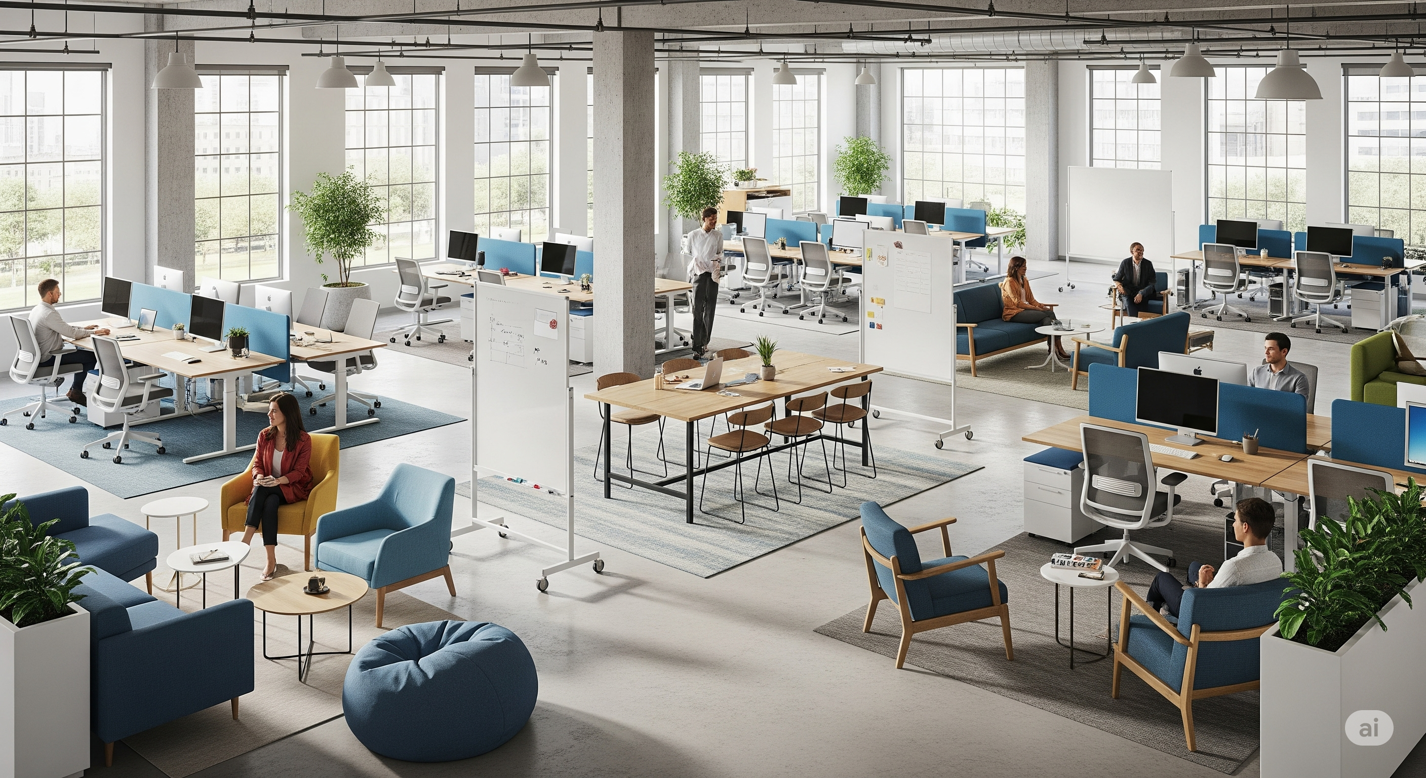 Thiết kế mở là một trong những xu hướng hiện đại hóa văn phòng phổ biến nhất. Không còn những bức tường kín mít, bàn làm việc riêng lẻ, thay vào đó là không gian mở, tối ưu sự kết nối và giao tiếp. Lợi ích rõ ràng: