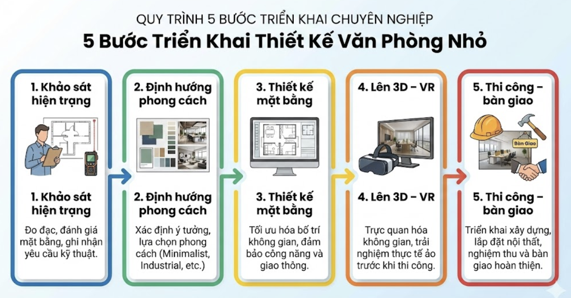 Quy trình này đảm bảo mọi dự án đều đạt chuẩn thiết kế văn phòng công ty nhỏ đẹp, thống nhất từ ý tưởng đến hoàn thiện.